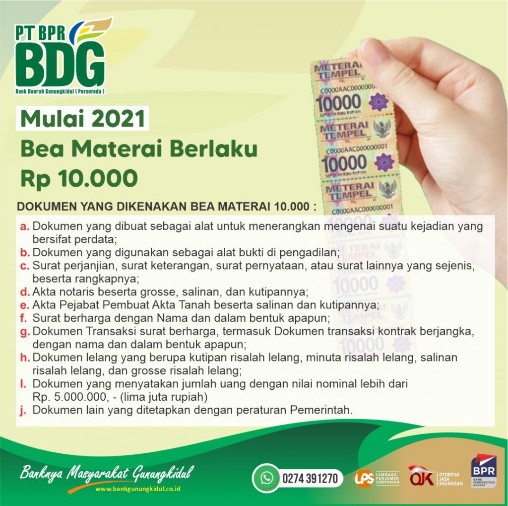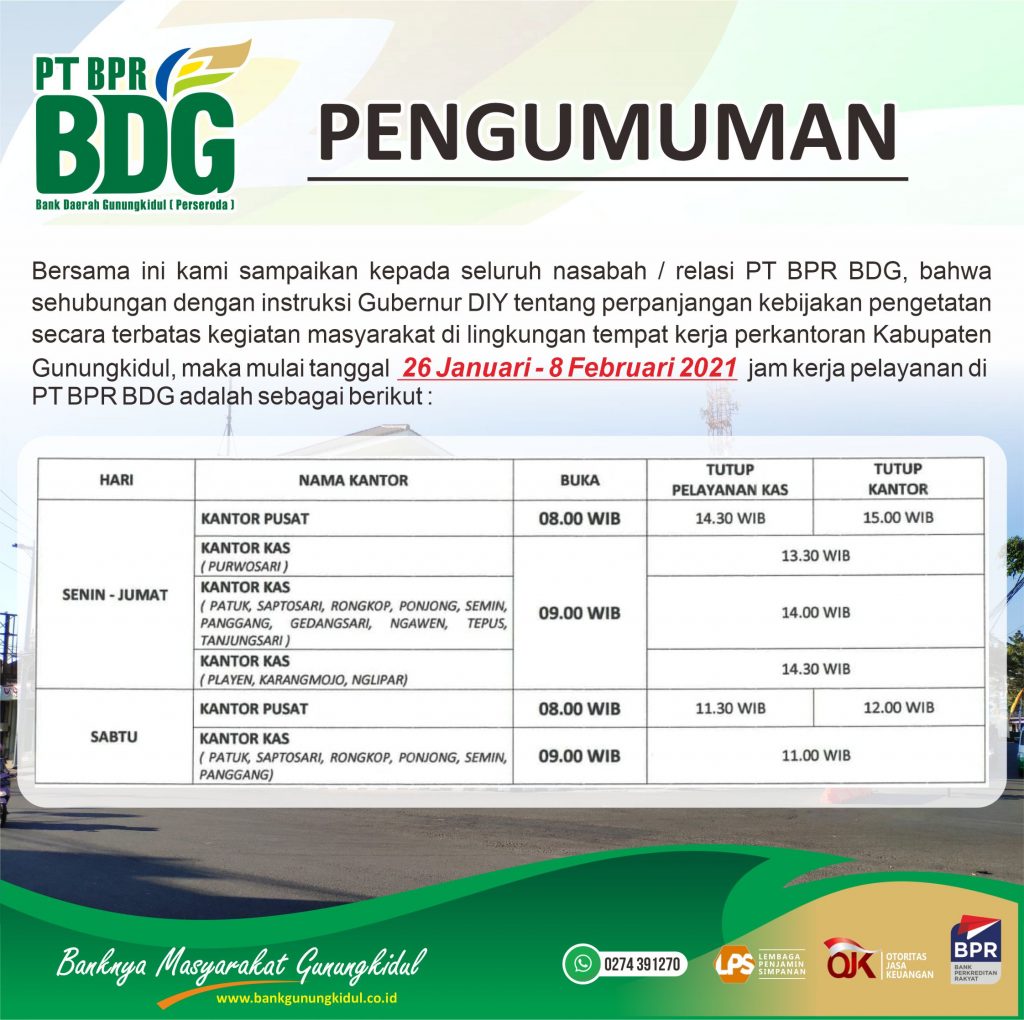 Bersama ini kami sampaikan kepada seluruh nasabah / relasi PT BPR BDG, bahwa sehubungan dengan instruksi Gubernur DIY tentang perpanjangan kebijakan pengetatan secara terbatas kegiatan masyarakat di lingkungan tempat kerja perkantoran Kabupaten Gunungkidul, maka mulai tanggal 26 Januari – 8 Februari 2021 jam kerja pelayanan di PT BPR BDG adalah sebagai berikut :