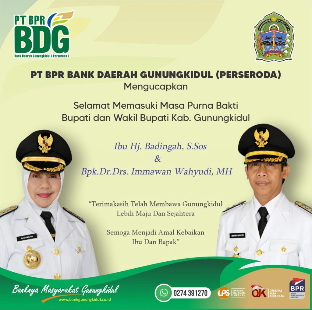 PT BPR BANK DAERAH GUNUNGKIDUL (PERSERODA) Mengucapkan Selamat Memasuki Masa Purna Bakti Bupati dan Wakil Bupati Kab. Gunungkidul Ibu Hj. Badingah, S.Sos & Bpk.Dr.Drs. Immawan Wahyudi, MH “Terimakasih Telah Membawa Gunungkidul Lebih Maju Dan Sejahtera Semoga Menjadi Amal Kebaikan Ibu Dan Bapak”