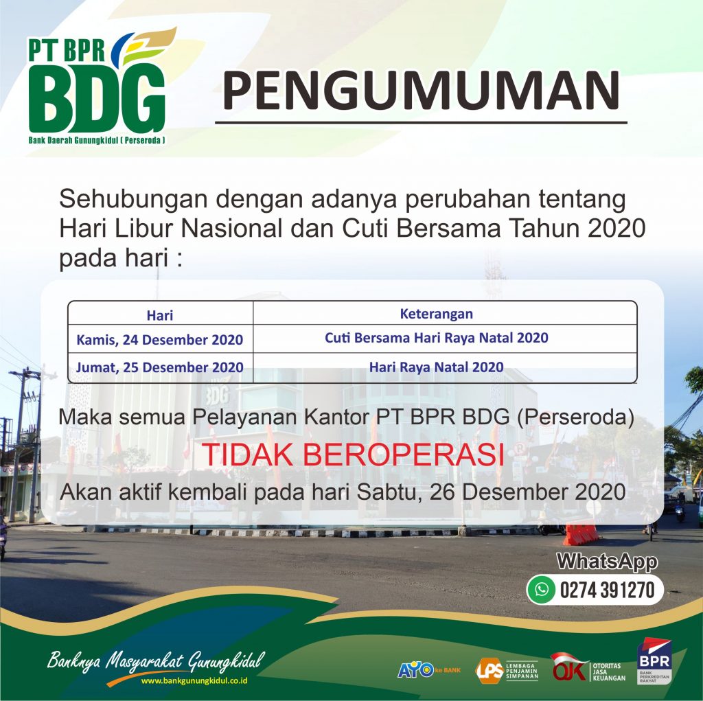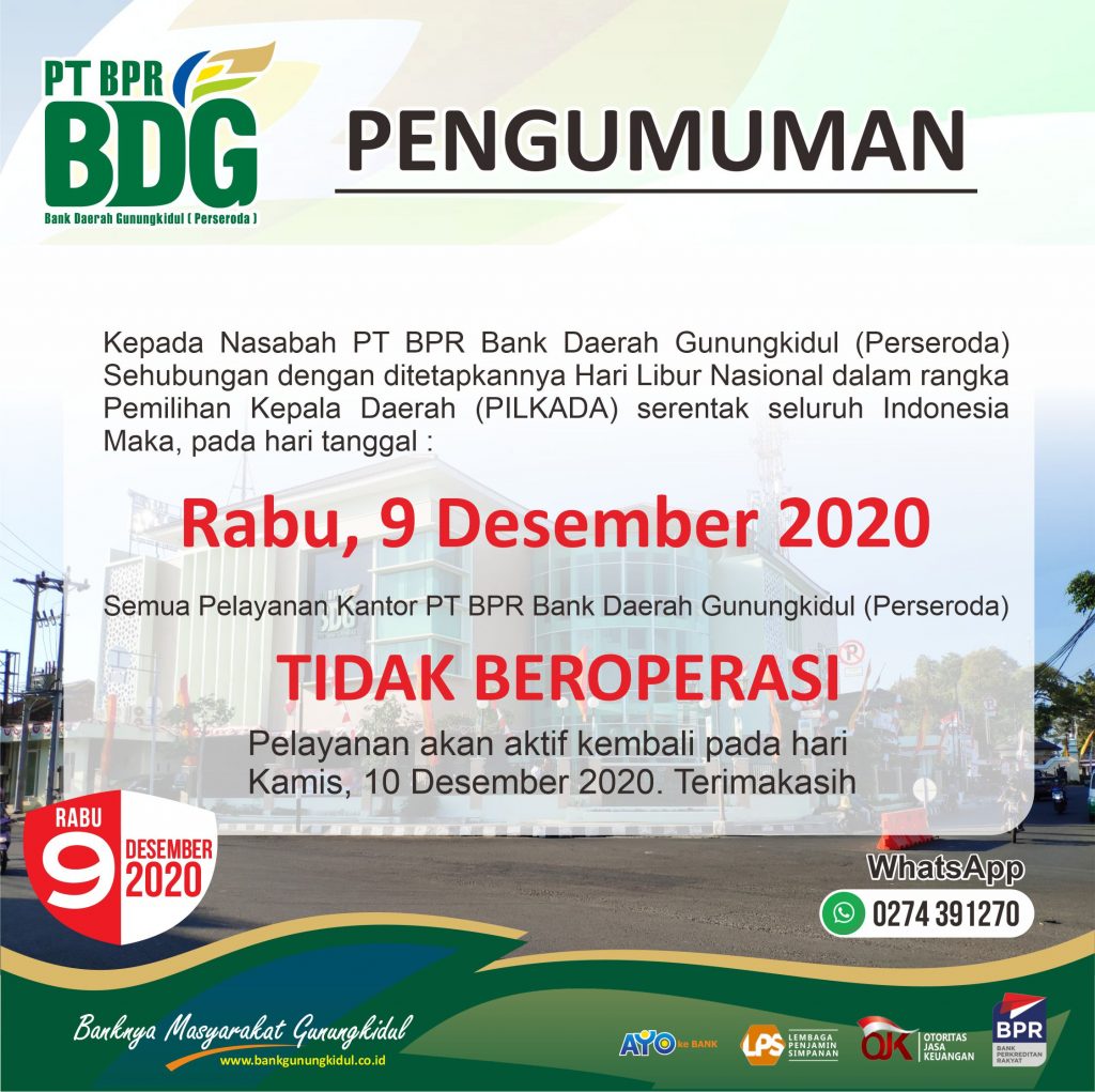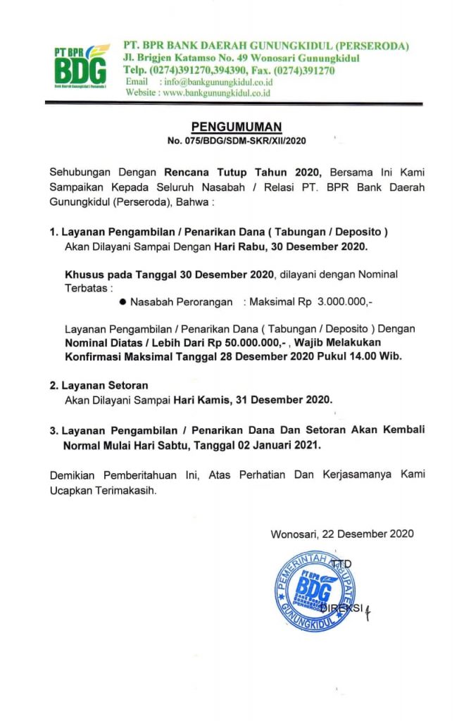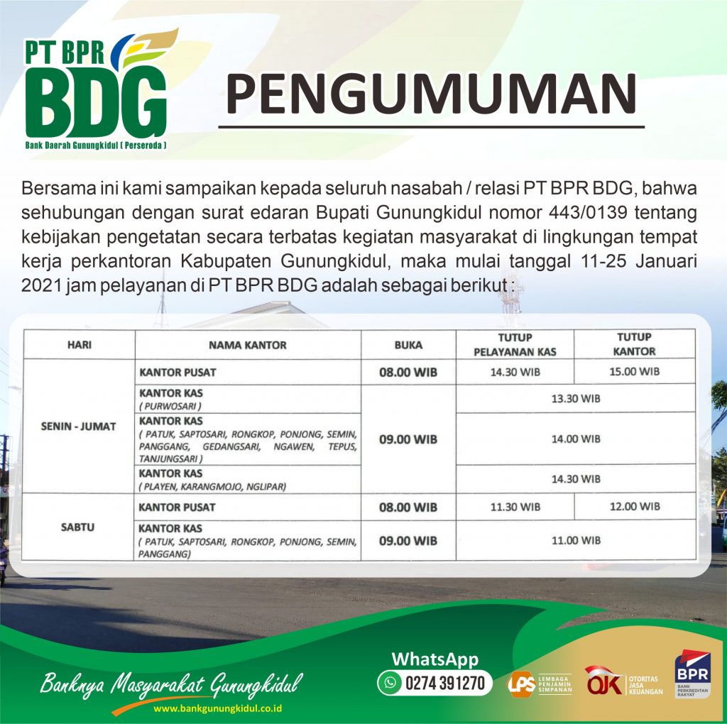 Bersama ini kami sampaikan kepada seluruh nasabah / relasi PT BPR BDG, bahwa sehubungan dengan surat edaran Bupati Gunungkidul nomor 443/0139 tentang kebijakan pengetatan secara terbatas kegiatan masyarakat di lingkungan tempat kerja perkantoran Kabupaten Gunungkidul, maka mulai tanggal 11-25 Januari 2021 jam pelayanan di PT BPR BDG adalah sebagai berikut :