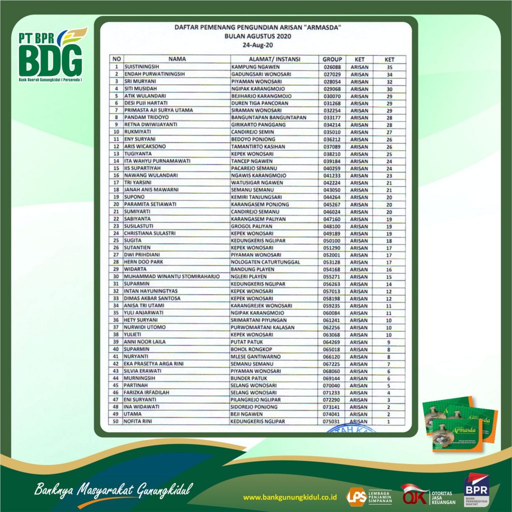 DAFTAR PEMENANG UNDIAN ARMASDA PERIODE AGUSTUS 2020