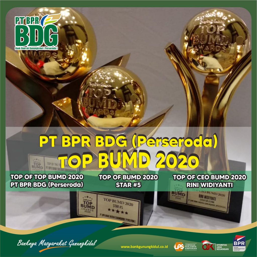 TOP BUMD 2020 PT BPR BANK DAERAH GUNUNGKIDUL (Perseroda) Meraih Penghargaan : 1. TOP OF TOP BUMD 2020 “PT BPR BANK DAERAH GUNUNGKIDUL (Perseroda)” 2. TOP OF BUMD 2020 “STAR #5” 3. TOP OF CEO BUMD 2020 “Rini Widiyanti”