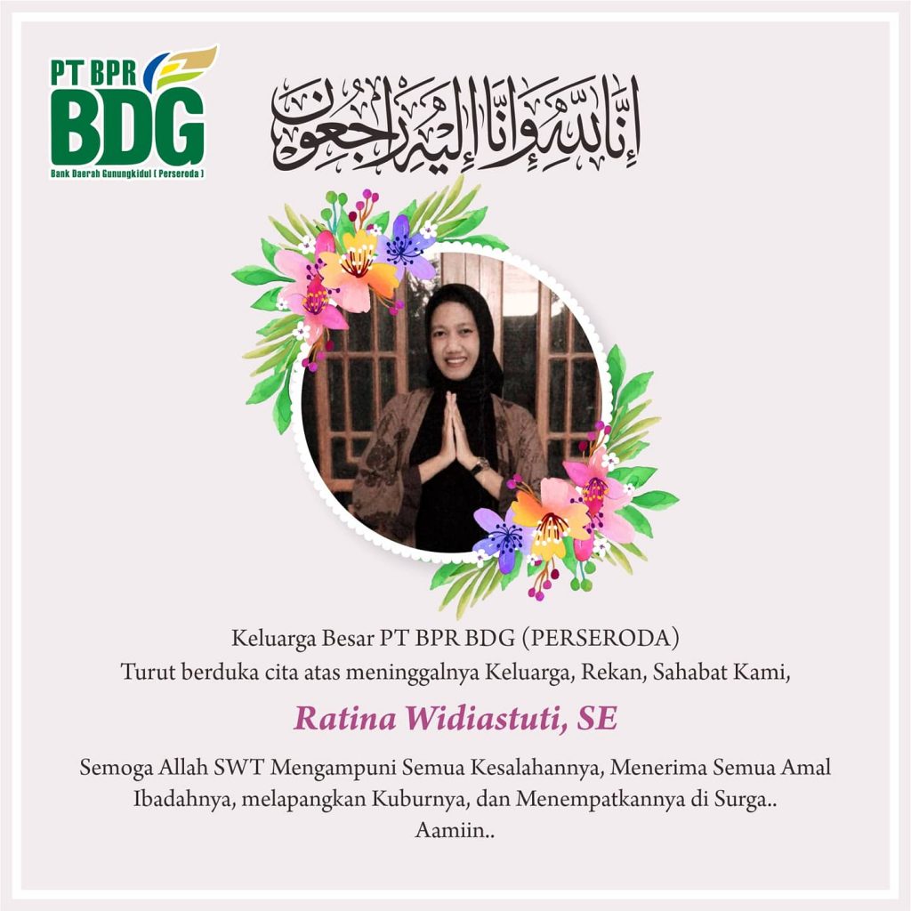 Inna Lillahi Wa Inna Ilaihi Roji’un Keluarga Besar PT BPR BDG (PERSERODA) Turut berduka cita atas meninggalnya Keluarga, Rekan, Sahabat Kami Ratina Widiastuti, SE Semoga Allah Mengampuni Semua Kesalahannya, Menerima Semua Amal Ibadahnya, melapangkan Kuburnya, dan Menempatkannya di Surga.. Aamiin..