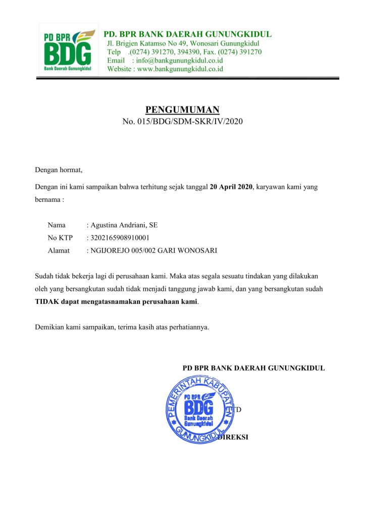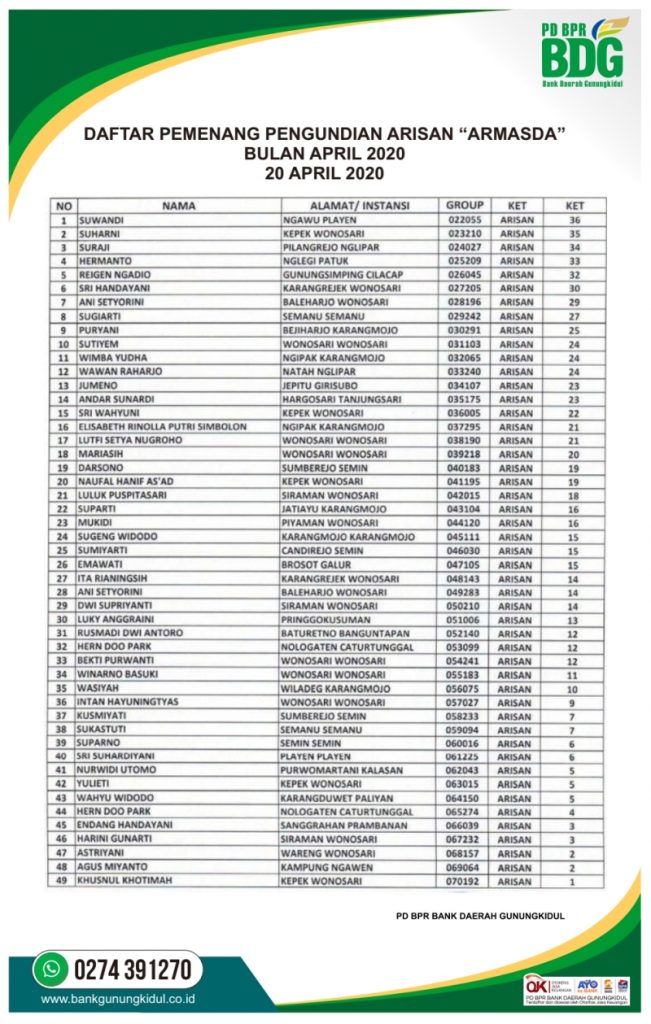 Sehubungan dengan adanya pandemi covid-19 (corona) dan himbauan pemerintah untuk melaksanakan social distancing, kami sampaikan bahwa undian tabungan Armasda Bank Daerah Gunungkidul akan dilaksanakan secara online melalui instagram PD BPR BANK DAERAH GUNUNGKIDUL @bankgunungkidul pada :Senin, 20 April 2020 jam 10.00 Wib. Setoran bisa melalui transfer dari bank umum ke rekening berikut ini,
