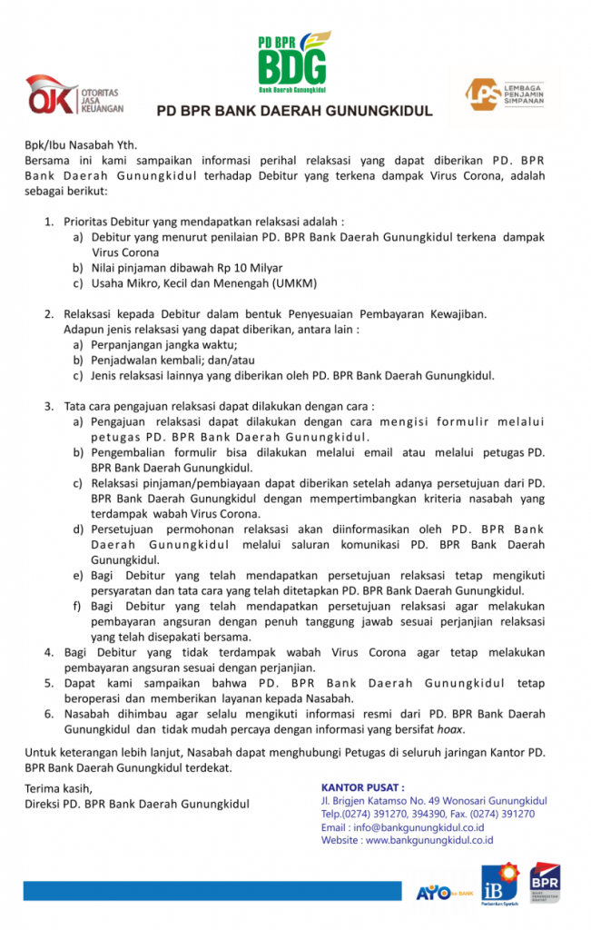 Bpk/Ibu Nasabah Yth. Bersama ini kami sampaikan informasi perihal relaksasi yang dapat diberikan PD. BPR Bank Daerah Gunungkidul terhadap Debitur yang terkena dampak Virus Corona, adalah sebagai berikut: 1. Prioritas Debitur yang mendapatkan relaksasi adalah : Debitur yang menurut penilaian PD. BPR Bank Daerah Gunungkidul terkena dampak Virus Corona Nilai pinjaman/pembiayaan dibawah Rp 10 […]