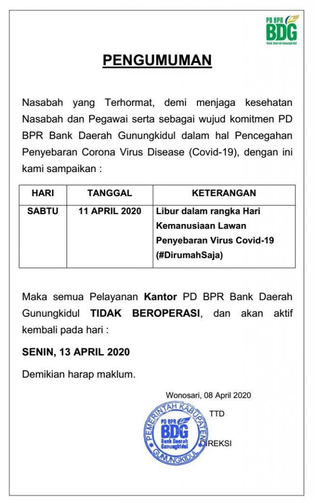 PENGUMUMAN Nasabah yang terhormat, demi menjaga kesehatan Nasabah dan Pegawai serta sebagai wujud komitmen PD BPR Bank Daerah Gunungkidul dalam hal pencegahan Penyebaran Corona Virus Disease (Covid-19), dengan ini kami sampaikan : Hari Sabtu, Tanggal 11 April 2020 semua pelayanan Kantor PD BPR BDG TIDAK BEROPERASI (Libur Dalam Rangka hari Kemanusiaan Lawan Penyebaran covid-19 #dirumahsaja […]