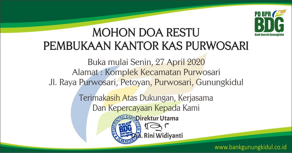 MOHON DOA RESTU PEMBUKAAN KANTOR KAS PURWOSARI Buka mulai Senin, 27 April 2020 Alamat : Komplek Kecamatan Purwosari Jalan Raya Purwosari, Petoyan, Purwosari, Gunungkidul Terimakasih Atas Dukungan, kerjasama dan Kepercayaan Kepada Kami