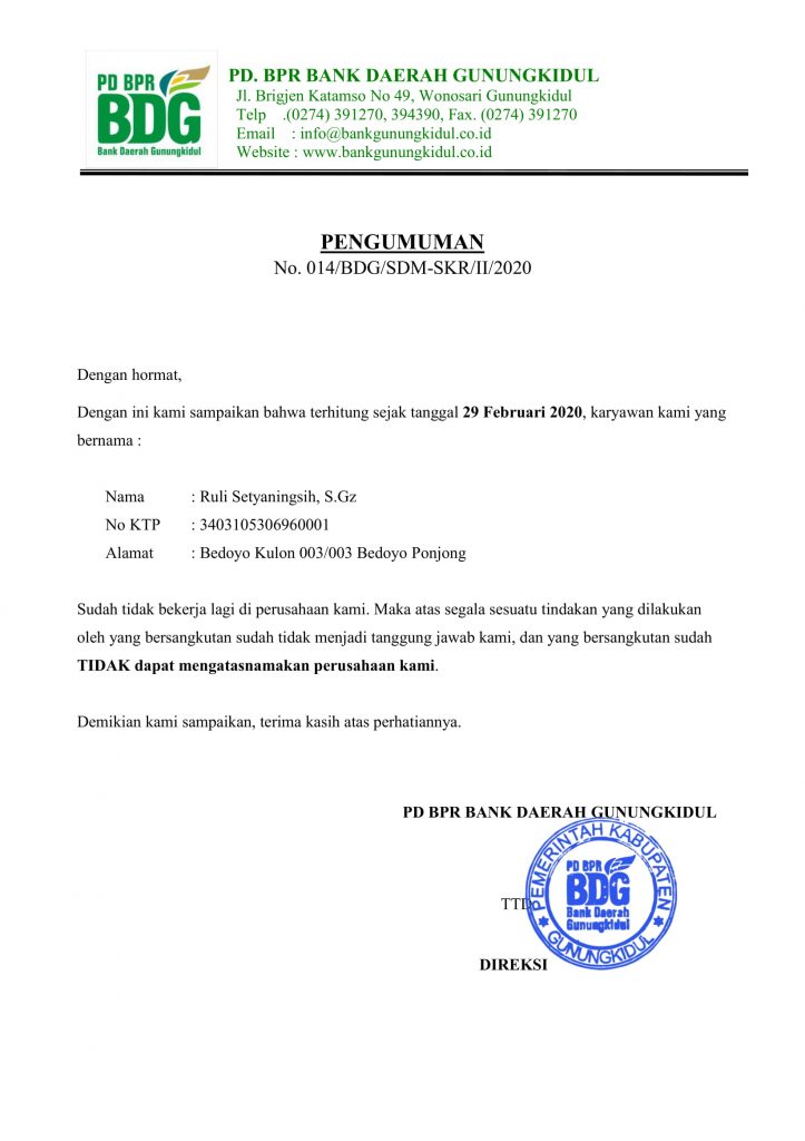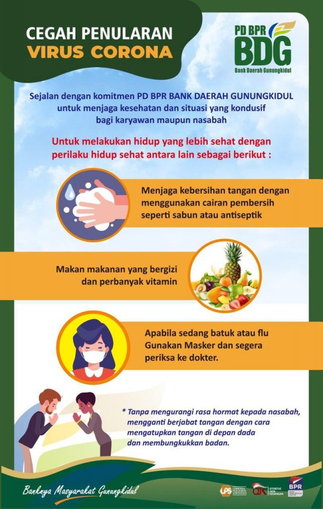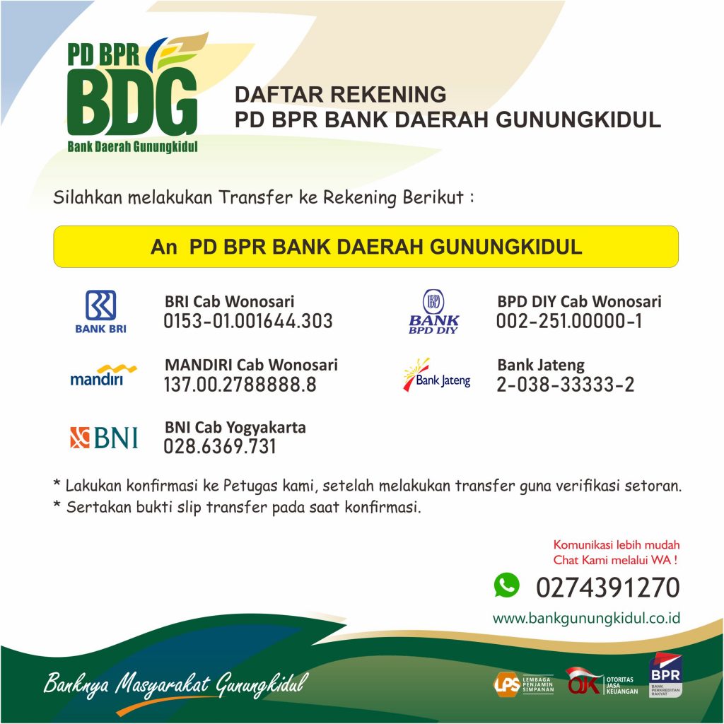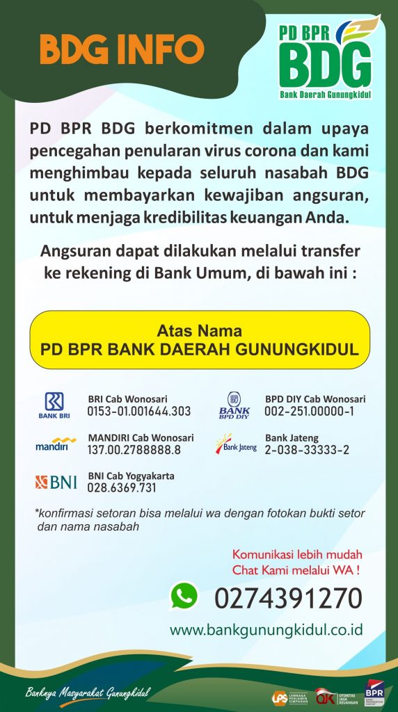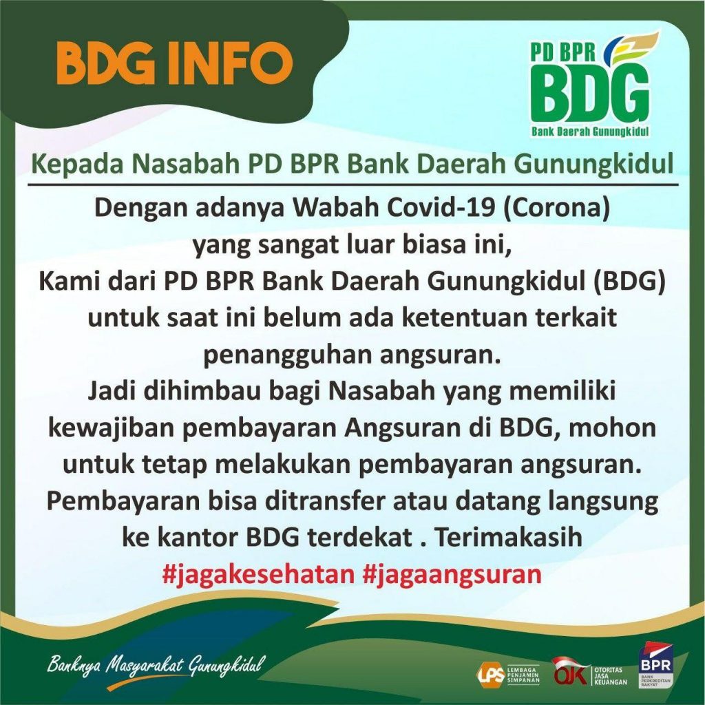 Kepada Nasabah PD BPR Bank Daerah Gunungkidul Dengan adanya Wabah Covid-19 (Corona) yang sangat luar biasa ini, Kami dari PD BPR Bank Daerah Gunungkidul (BDG) untuk saat ini belum ada ketentuan terkait penangguhan angsuran. Jadi dihimbau bagi Nasabah yang memiliki kewajiban pembayaran Angsuran di BDG, mohon untuk tetap melakukan pembayaran angsuran. Pembayaran bisa ditransfer atau datang langsung ke […]