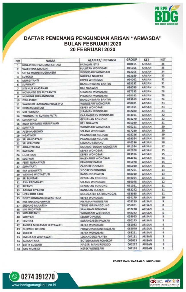 Daftar Pemenang Arisan Armasda Periode Februari 2020