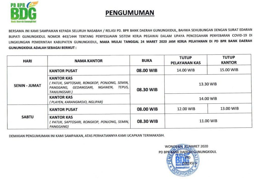 BERSAMA INI KAMI SAMPAIKAN KEPADA SELURUH NASABAH / RELASI PD. BPR BANK DAERAH GUNUNGKIDUL, BAHWA SEHUBUNGAN DENGAN SURAT EDARAN BUPATI GUNUNGKIDUL NOMOR 443/1444 TENTANG PENYESUAIAN SISTEM KERJA PEGAWAI DALAM UPAYA PENCEGAHAN PENYEBARAN COVID-19 DI LINGKUNGAN PEMERINTAH KABUPATEN GUNUNGKIDUL, MAKA MULAI TANGGAL 24 MARET 2020 JAM KERJA PELAYANAN DI PD BPR BANK DAERAH GUNUNGKIDUL ADALAH SEBAGAI BERIKUT […]