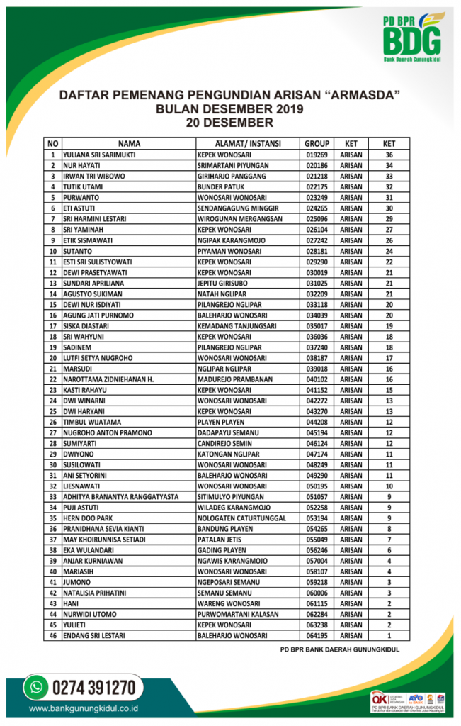 Daftar Pemenang Arisan Armasda Periode Desember 2019