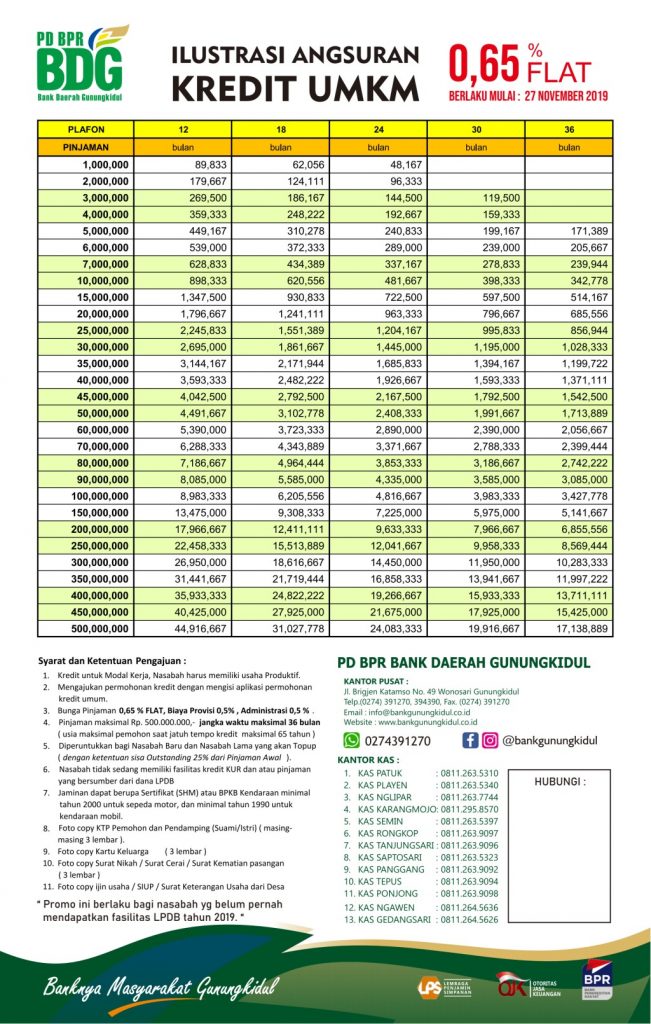 Telah Hadir kembali Promo Kredit KUAAT (Kredit Usaha Akhir Awal Tahun) 2019/2020 dengan angsuran ringan dan persyaratan yang mudah. Segera ajukan di Jaringan Kantor BDG terdekat. Ilustrasi angsuran dapat dilihat dibawah ini :