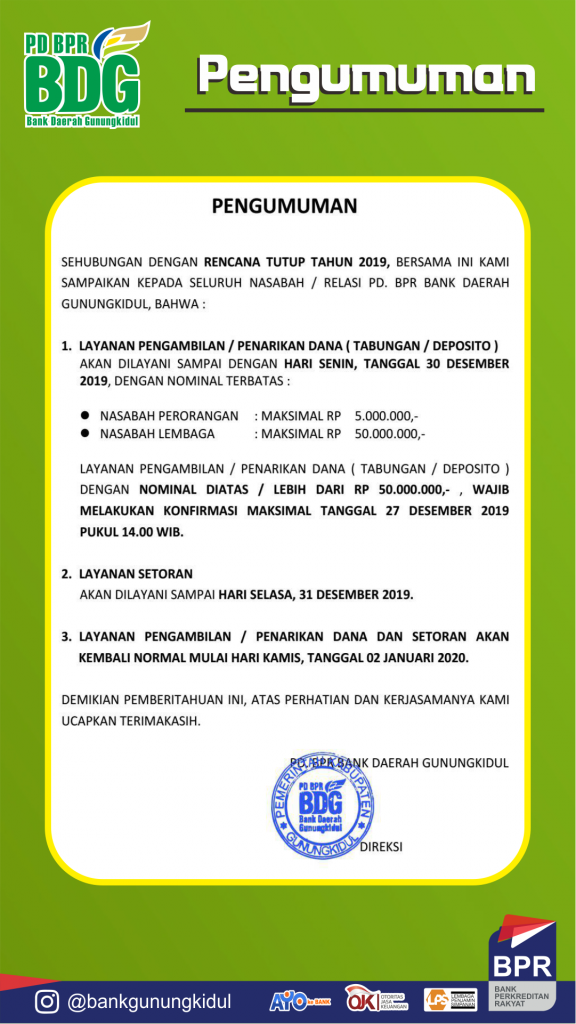 Pengumuman Batas Penarikan & Setoran Dana dalam rangka Tutup Tahun 2019