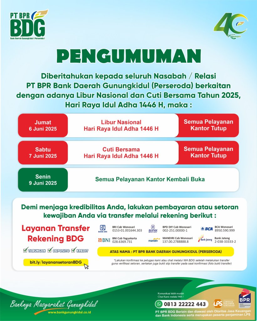 40 Tahun Bank Daerah Gunungkidul: Migunani dan Perkuat Komitmen Membangun Ekonomi Daerah Gunungkidul, 1 Juni 2025 — Memasuki usia ke-40, Bank Daerah Gunungkidul (BDG) menegaskan kembali jati dirinya sebagai lembaga keuangan yang MIGUNANI (MelayanI GUNungkidul HandayANI). Momentum ini dijadikan sebagai langkah memperkuat komitmen dalam membangun ekonomi daerah secara inklusif dan berkelanjutan. Didirikan pada tahun 1985, […]