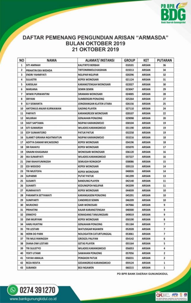 Daftar Pemenang Arisan Armasda Periode Oktober 2019 Penentuan Pemenang diundi pada tanggal 21 Oktober 2019 di Kantor Pusat PD BPR Bank Daerah Gunungkidul.