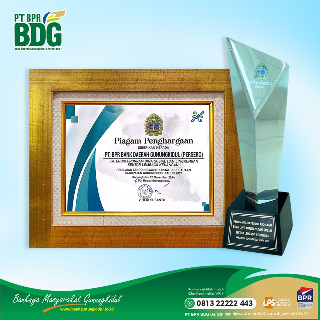 PT BPR Bank Daerah Gunungkidul (Perseroda) Telah Merai PenghargaanKATEGORI PROGRAM BINA SOSIAL DAN LINGKUNGANSEKTOR LEMBAGA KEUANGANPENILAIAN TANGGUNGJAWAB SOSIAL PERUSAHAANKABUPATEN GUNUNGKIDUL TAHUN 2024