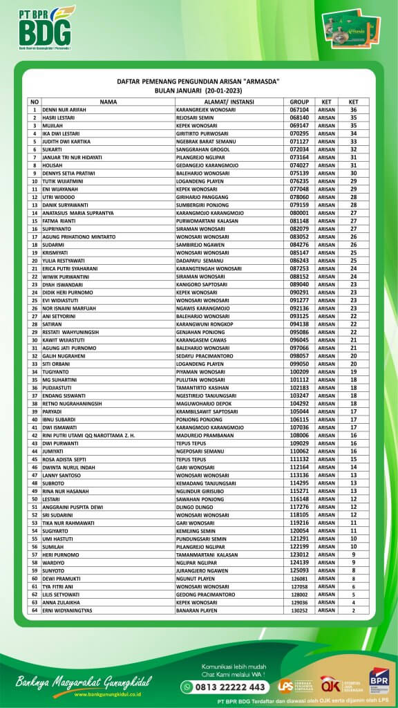Pemenang Armasda, Pengumuman DAFTAR PEMENANG PENGUNDIAN ARISAN “ARMASDA” BULAN JANUARI 2023 DAFTAR PEMENANG PENGUNDIAN ARISAN “ARMASDA” BULAN JANUARI 2023 PENGUMUMAN CUTI BERSAMA TAHUN BARU IMLEK SELAMAT TAHUN BARU IMLEK
