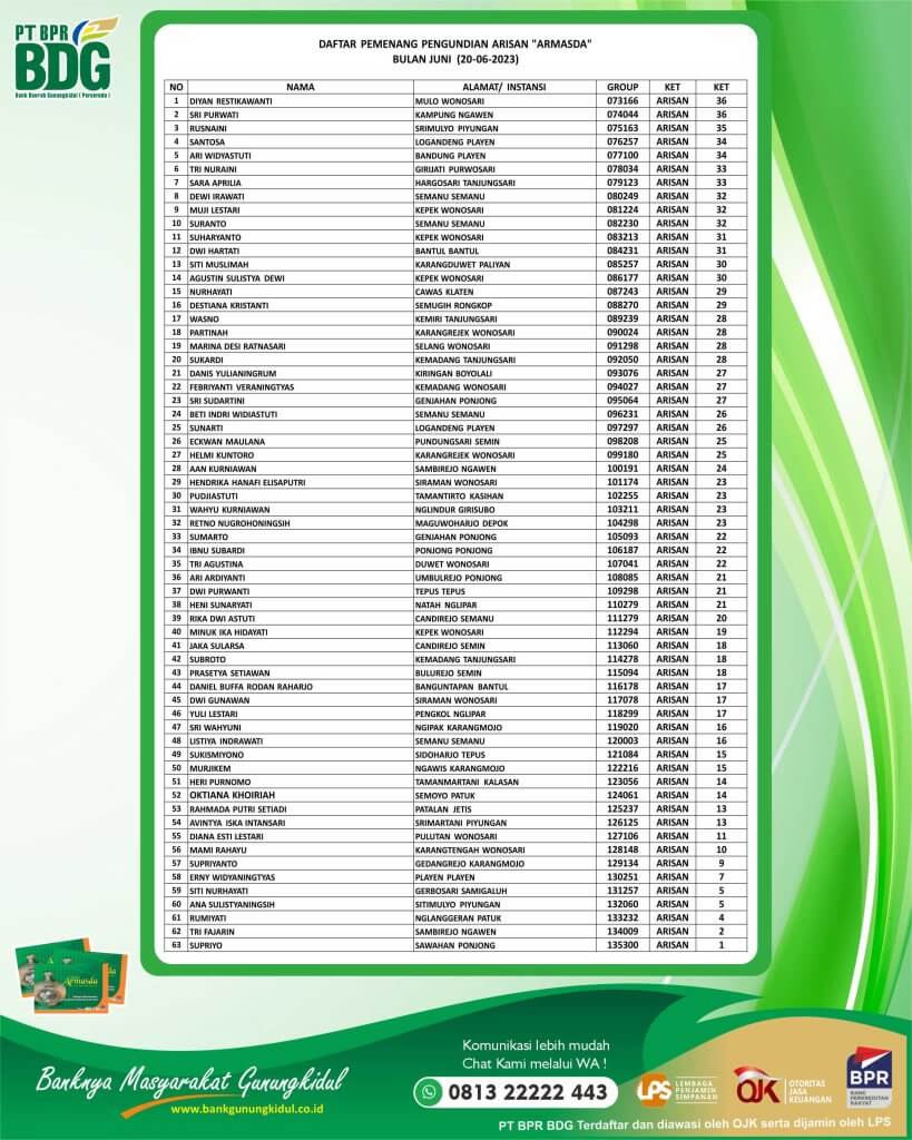 Pemenang Armasda, Pengumuman DAFTAR PEMENANG PENGUNDIAN ARISAN “ARMASDA” BULAN JUNI 2023 DAFTAR PEMENANG PENGUNDIAN ARISAN “ARMASDA” BULAN JUNI 2023 PENGUMUMAN KANTOR KAS NGLIPAR BARU INFORMASI OPERASIONAL SEHUBUNGAN DENGAN CUTI HARI RAYA IDUL ADHA 1444 H