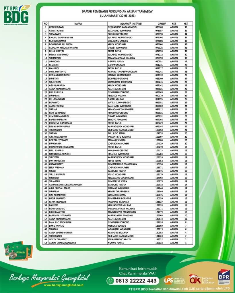 Pemenang Armasda DAFTAR PEMENANG PENGUNDIAN ARISAN “ARMASDA” BULAN MARET 2023 DAFTAR PEMENANG PENGUNDIAN ARISAN “ARMASDA” BULAN MARET 2023 PENGUMUMAN KANTOR BARU KAS TANJUNGSARI PENGUMUMAN OPERASIONAL BDG 22-23 MARET 2023