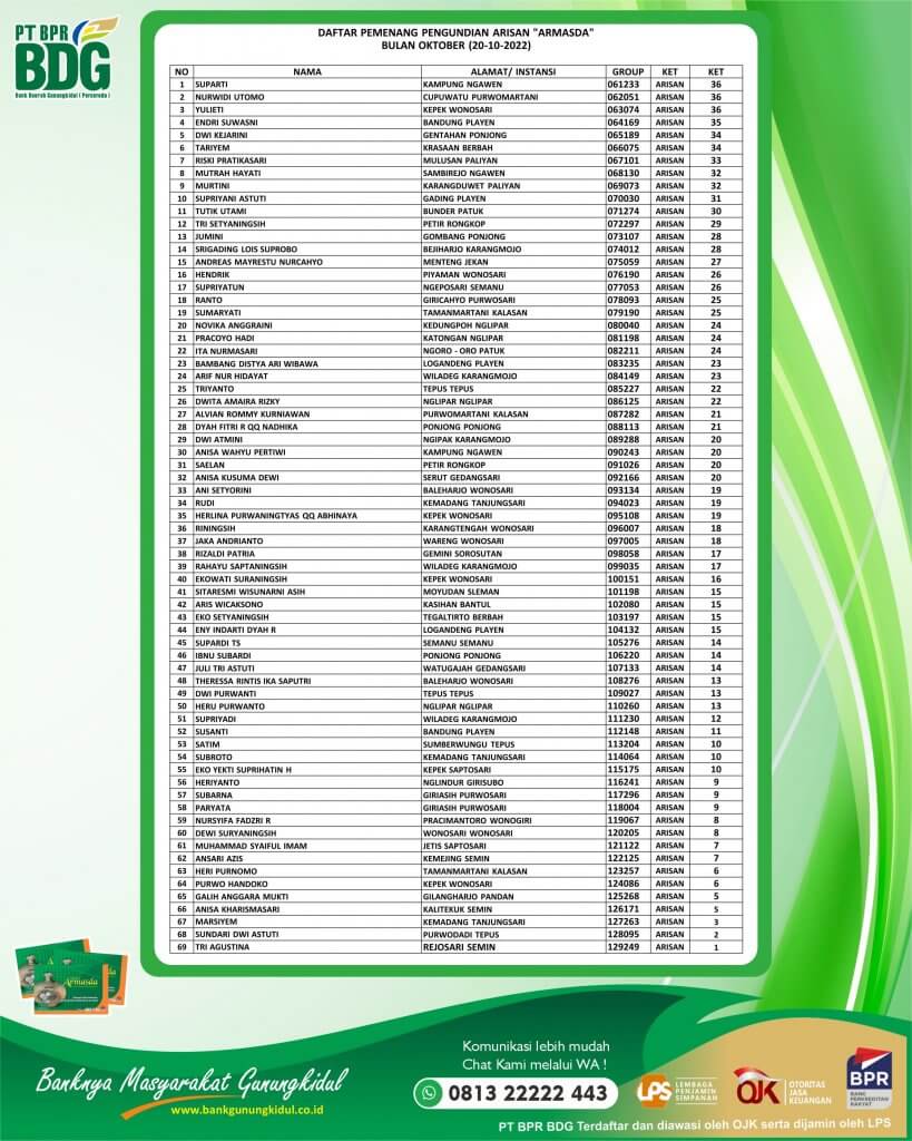 Pemenang Armasda, Pengumuman DAFTAR PEMENANG PENGUNDIAN ARISAN “ARMASDA” BULAN OKTOBER 2022 PELANTIKAN GUBERNUR & WAKIL GUBERNUR DAERAH ISTIMEWA YOGYAKARTA Laporan Publikasi Triwulan III September 2022