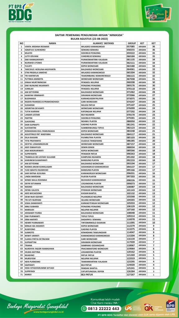 Pemenang Armasda, Pengumuman DAFTAR PEMENANG PENGUNDIAN ARISAN “ARMASDA” BULAN AGUSTUS 2022 DAFTAR PEMENANG PENGUNDIAN ARISAN ARMASDA PERIODE AGUSTUS 2022 DIRGAHAYU REPUBLIK INDONESIA “PULIH LEBIH CEPAT BANGKIT LEBIH KUAT” (17 AGUSTUS 1945 – 17 AGUSTUS 2022) Ciri-ciri Keaslian Uang Rupiah Kertas Tahun Emisi 2022