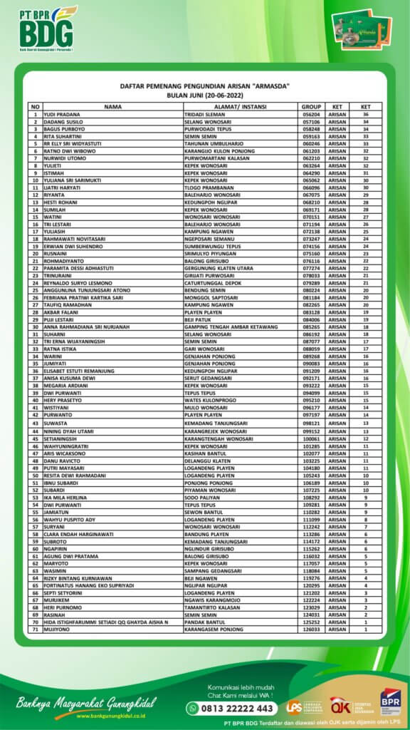 Pemenang Armasda, Pengumuman DAFTAR PEMENANG PENGUNDIAN ARISAN “ARMASDA” PERIODE JUNI 2022 PT BPR Bank Daerah Gunungkidul (Perseroda) telah meraih penghargaan pada acara TOP INFO 2022 Laporan Publikasi Triwulan II Juni 2022