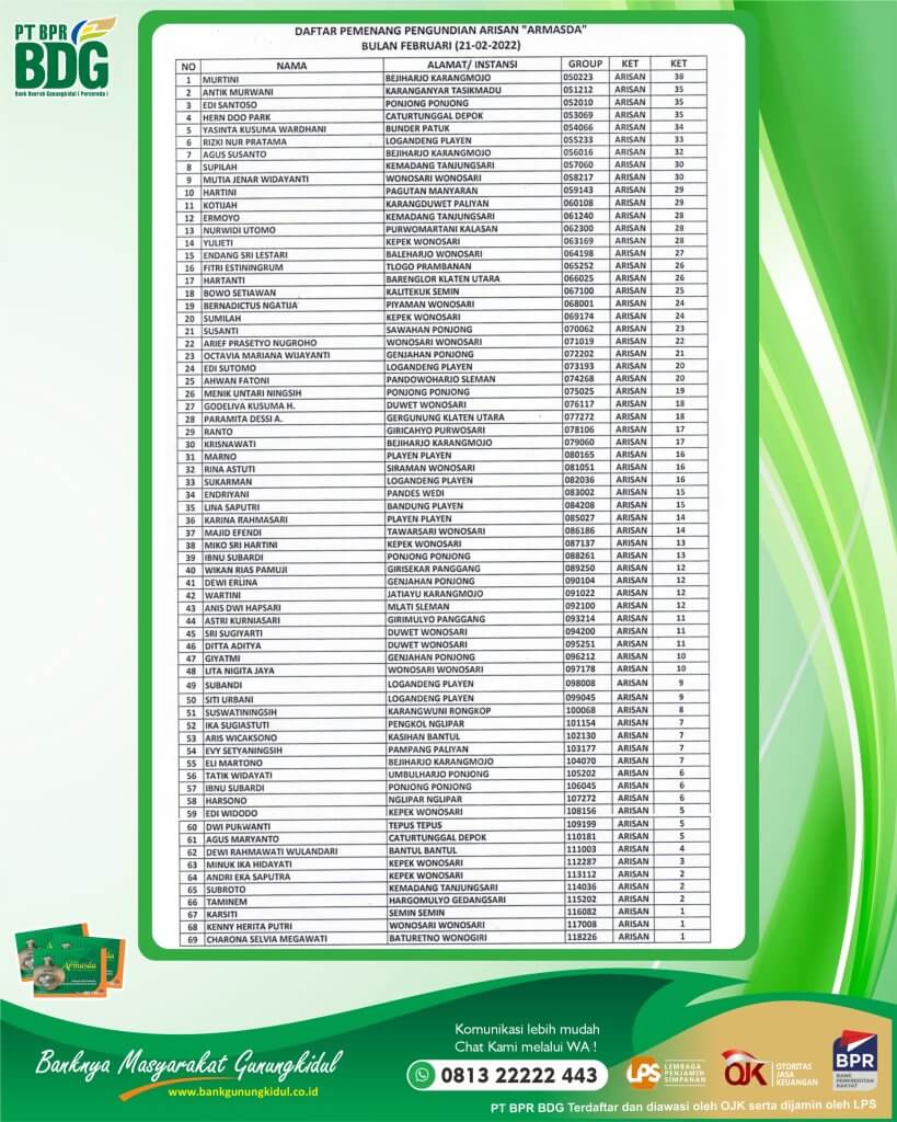 Pemenang Armasda, Pengumuman DAFTAR PEMENANG PENGUNDIAN ARMASDA PERIODE FEBRUARI 2022 DAFTAR PEMENANG PENGUNDIAN ARMASDA PERIODE FEBRUARI 2022 PENGUMUMAN KREDIT SELAMAT MEMPERINGATI ISRA MIRAJ NABI MUHAMMAD SAW