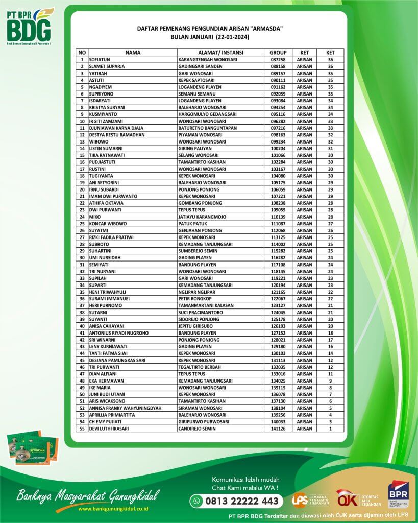 Pemenang Armasda, Pengumuman DAFTAR PEMENANG UNDIAN ARISAN “ARMASDA” JANUARI 2024 DAFTAR PEMENANG UNDIAN ARISAN ARMASDA JANUARI 2024 JADWAL / JAM OPERASIONAL BANK DAERAH GUNUNGKIDUL BUTUH DANA ? KREDIT BI BDG AJA !!