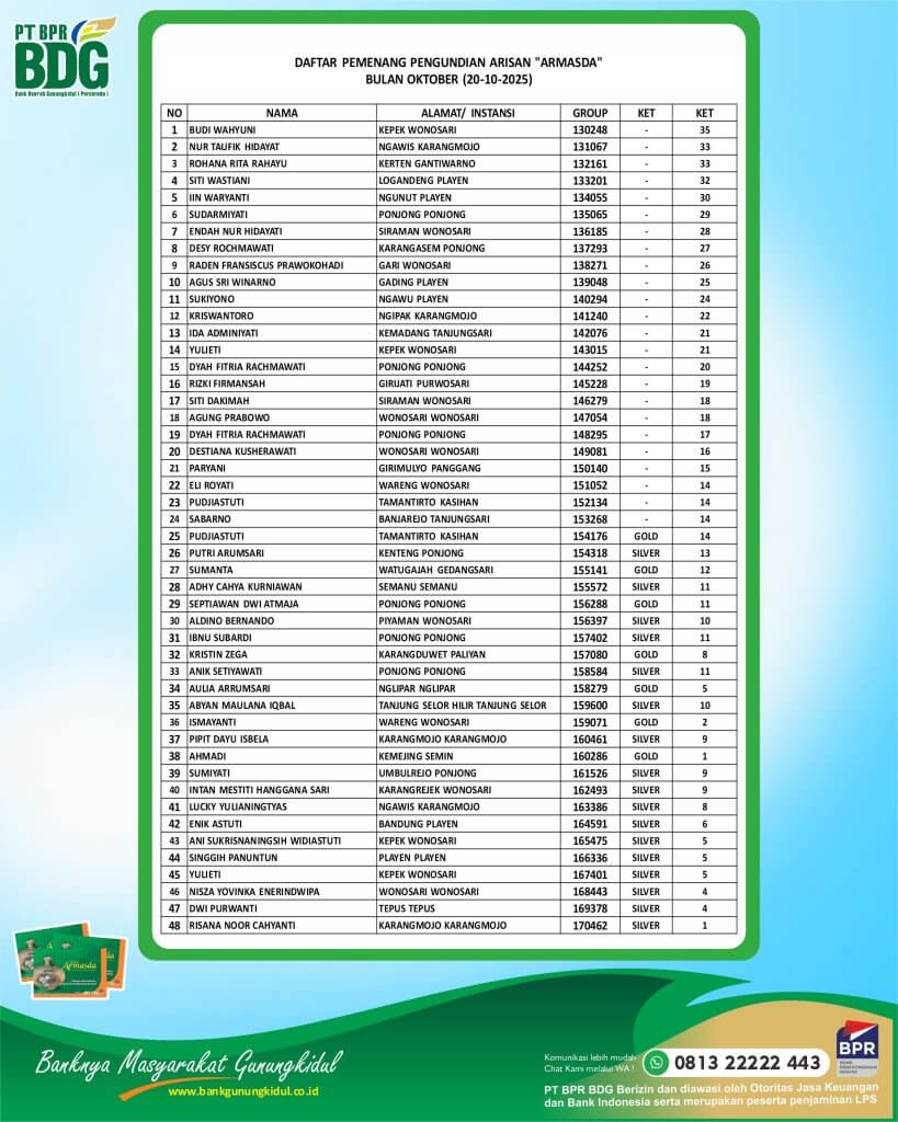 Pemenang Armasda, Pengumuman DAFTAR PEMENANG UNDIAN ARISAN “ARMASDA” OKTOBER 2025 DAFTAR PEMENANG UNDIAN ARISAN “ARMASDA” OKTOBER 2025 Dirgahayu Tentara Nasional Indonesia ke 80 SELAMAT MEMPERINGATI SUMPAH PEMUDA