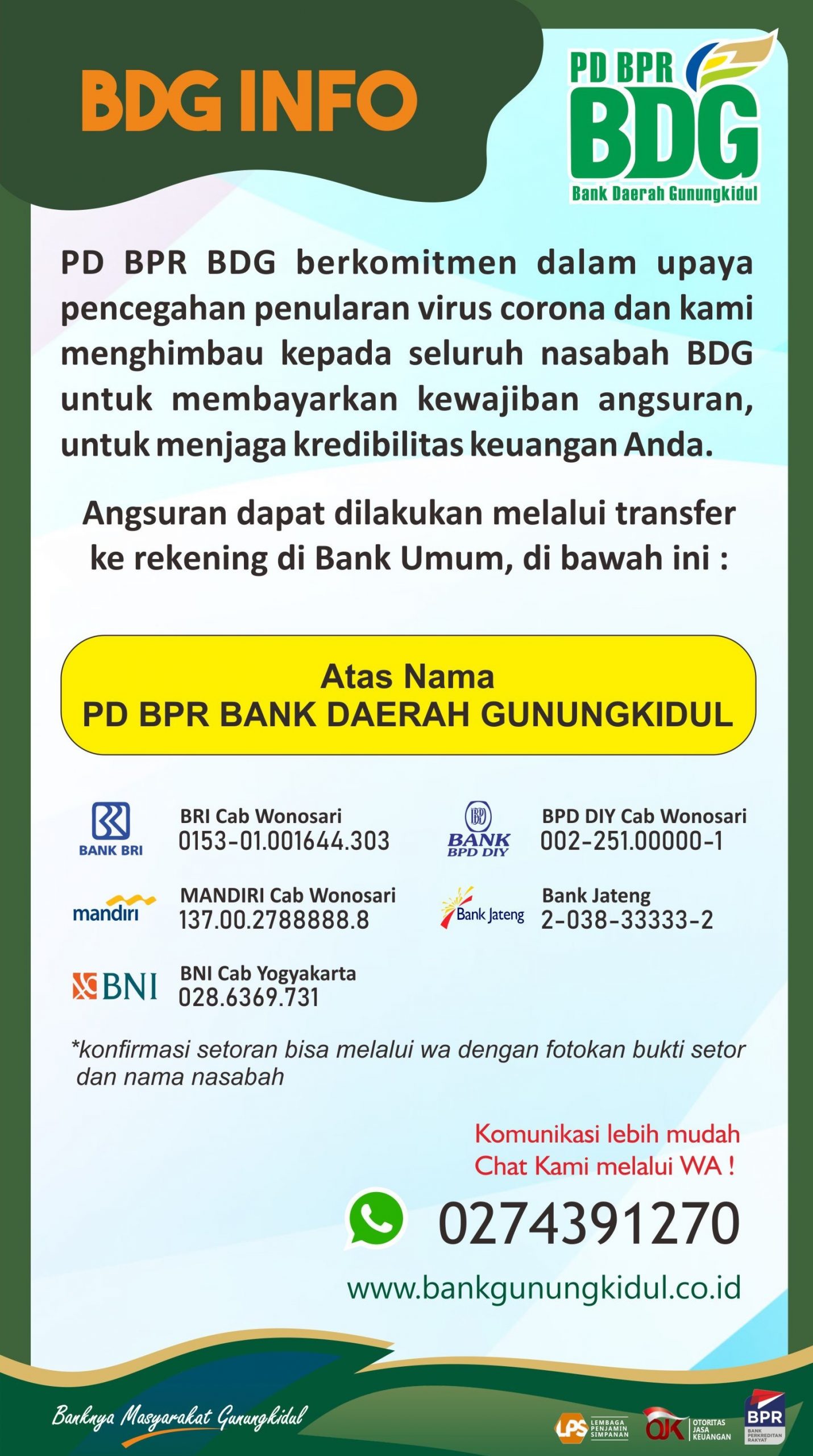 PD BPR BDG berkomitmen dalam upaya pencegahan penularan virus corona dan kami menghimbau kepada seluruh nasabah BDG untuk membayarkan kewajiban angsuran, untuk menjaga kredibilitas keuangan Anda. Angsuran dapat dilakukan melalui transfer ke rekening BDG di Bank Umum, dibawah ini :