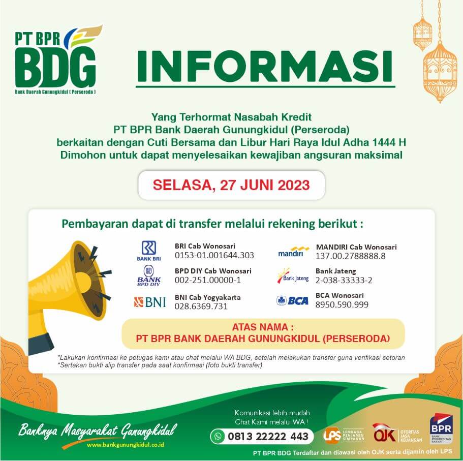 Diinformasikan kepada Nasabah Kredit PT BPR Bank Daerah Gunungkidul (Perseroda) berkaitan dengan Cuti Bersama dan Libur Hari Raya Idul Adha 1444 H, dimohon untuk dapat menyelesaikan kewajiban angsuran maksimal hari Selasa, 27 Juni 2023