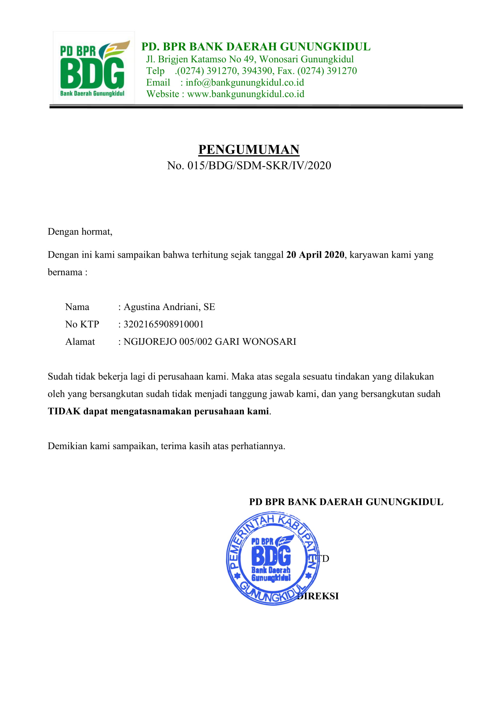 Pengumuman Informasi Pegawai Yang Sudah Tidak Bekerja di PD. BPR BDG a.n Agustina Andriani Penarikan Undian Tabungan Armasda Dilaksanakan secara Online Daftar Pemenang Arisan Armasda Periode April 2020