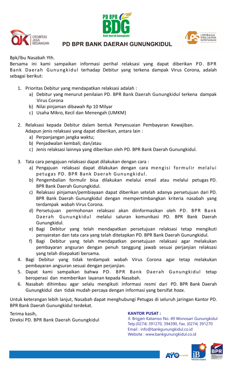 Bersama ini kami sampaikan informasi perihal relaksasi yang dapat diberikan PD. BPR Bank Daerah Gunungkidul terhadap Debitur yang terkena dampak Virus Corona, adalah sebagai berikut: