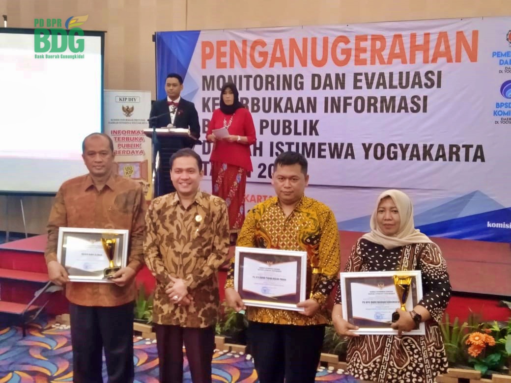 Yogyakarta, 28 September 2019. Syukur alhamdulillah PD BPR Bank Daerah Gunungkidul (Bank BDG) terpilih sebagai Terbaik III Kategori Badan Usaha Milik Daerah Se-DIY dalam Keterbukaan Informasi Badan Publik Tahun 2019, oleh Komisi Informasi Daerah DIY. Bank BDG juga merupakan satu-satunya perusahaan atau instansi dari Kabupaten Gunungkidul yang memperoleh penghargaan tersebut. Hal ini tentu saja menjadi kebanggaan tersendiri bahwasanya Bank BDG juga mengawali dalam memperoleh penghargaan tersebut, semoga kedepan Bank BDG bisa menjadi yang terbaik dan semakin membanggakan Kabupaten Gunungkidul dalam berprestasi.