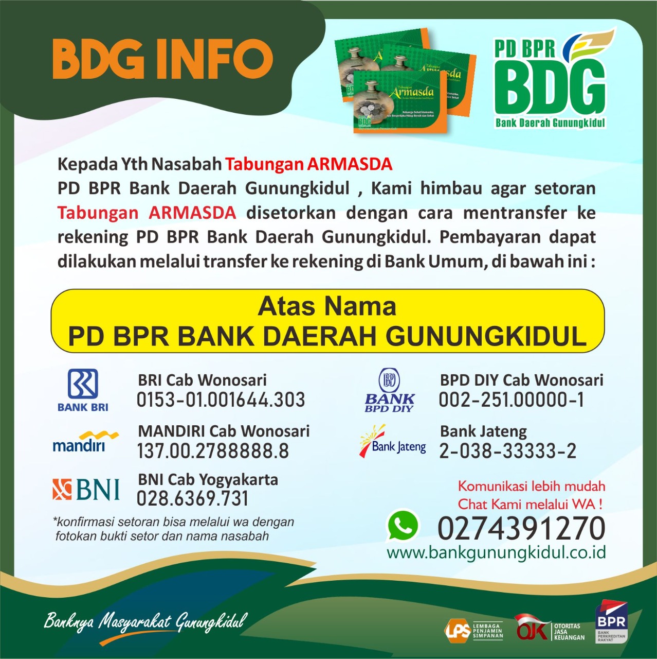 Sehubungan dengan adanya pandemi covid-19 (corona) dan himbauan pemerintah untuk melaksanakan social distancing, kami sampaikan bahwa undian tabungan Armasda Bank Daerah Gunungkidul akan dilaksanakan secara online melalui instagram PD BPR BANK DAERAH GUNUNGKIDUL @bankgunungkidul pada :
