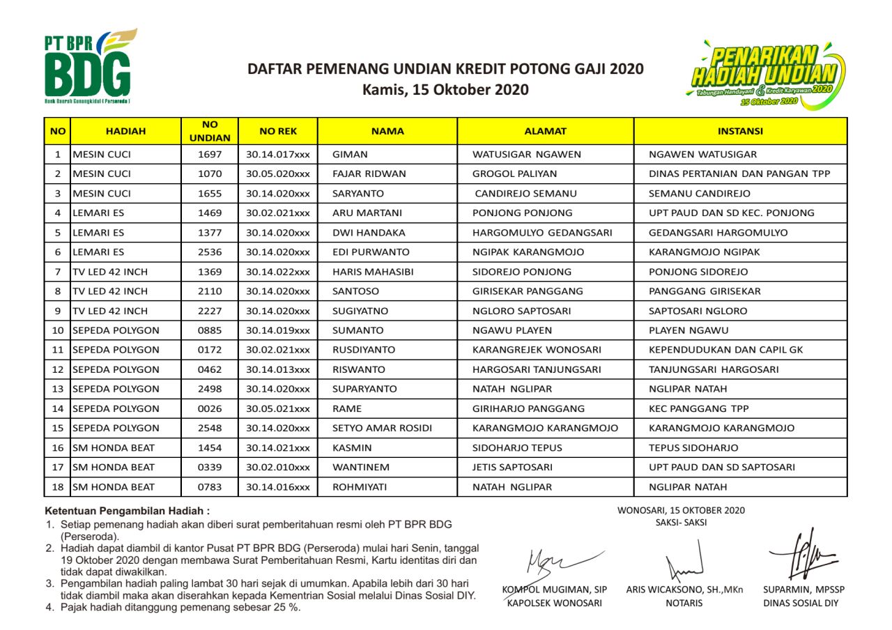 Penarikan Hadiah Undian Tabungan Handayani dan Kredit Potong Gaji 2020. Undian dilaksanakan di Kantor Pusat PT BPR BDG Perseroda Pada tanggal 15 Oktober 2020 pukul 08.00 WIB s/d selesai. Siarkan langsung Live streaming Youtube BPR BDG, Sorot Media, Dan Kominfo Gunungkidul.