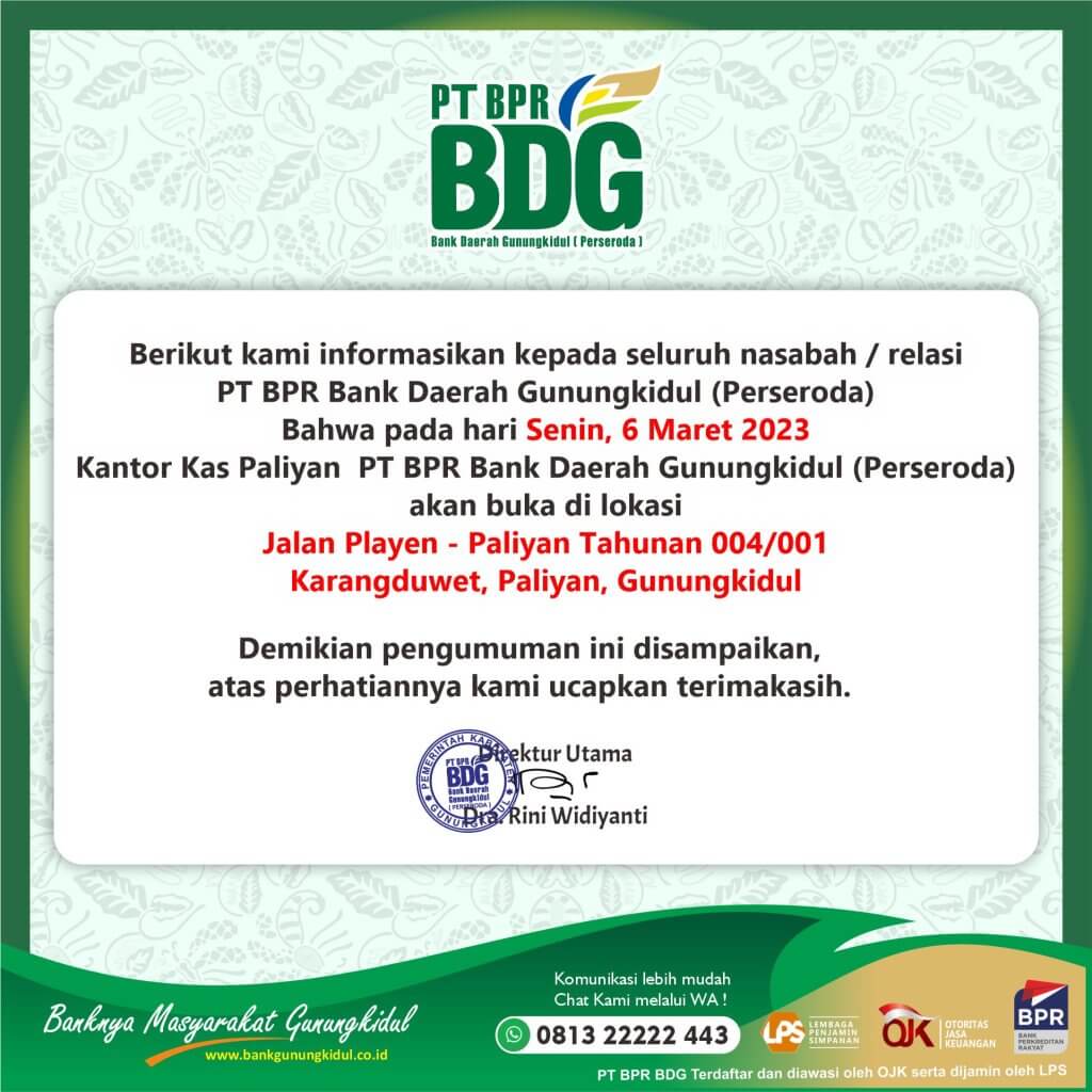 Pengumuman PENGUMUMAN KANTOR BARU KAS PALIYAN PENGUMUMAN KANTOR BARU KAS PALIYAN PENGUMUMAN OPERASIONAL PENGUMUMAN KANTOR BARU KAS TANJUNGSARI