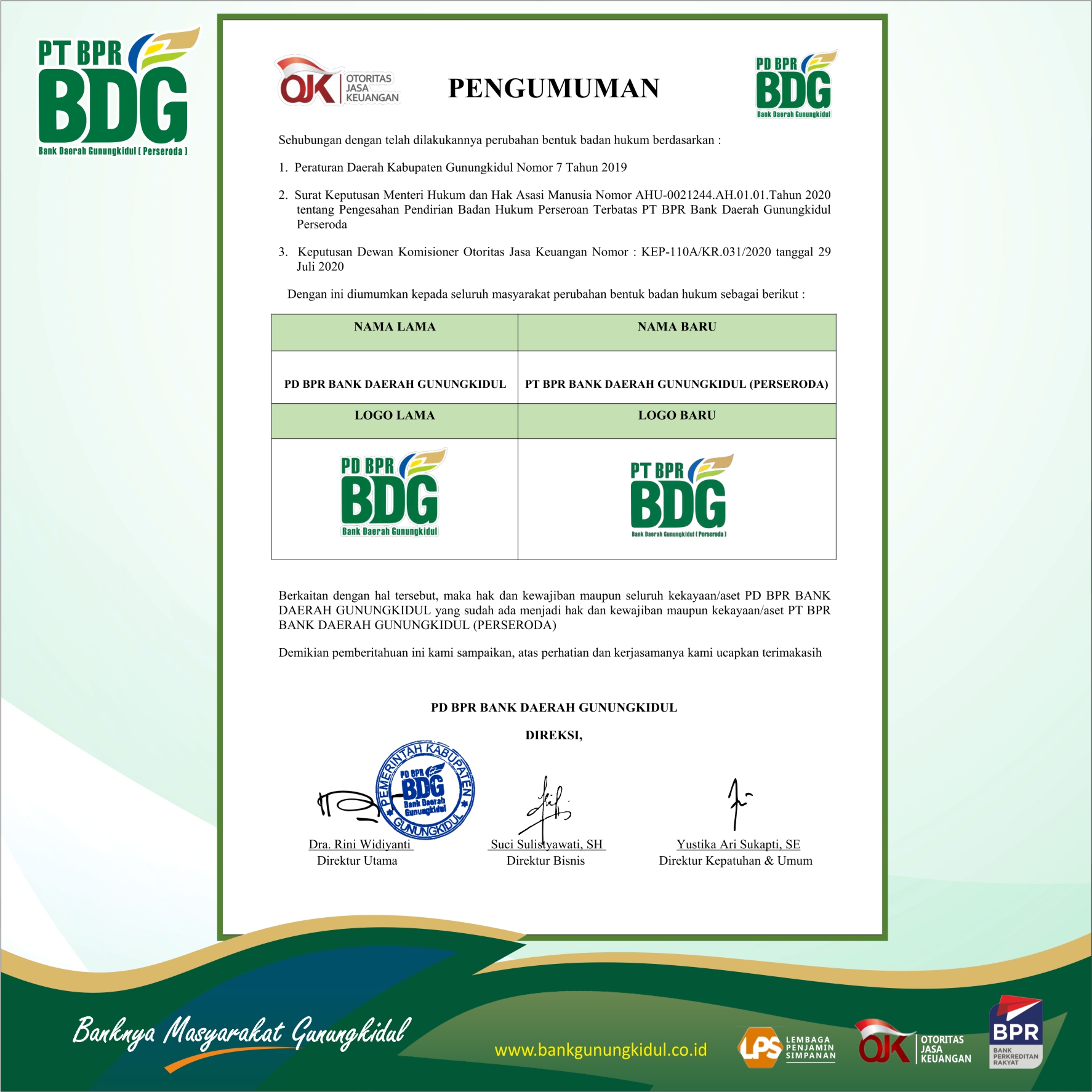 PENGUMUMAN PERUBAHAN BADAN HUKUM PT BPR BANK DAERAH GUNUNGKIDUL (Perseroda)