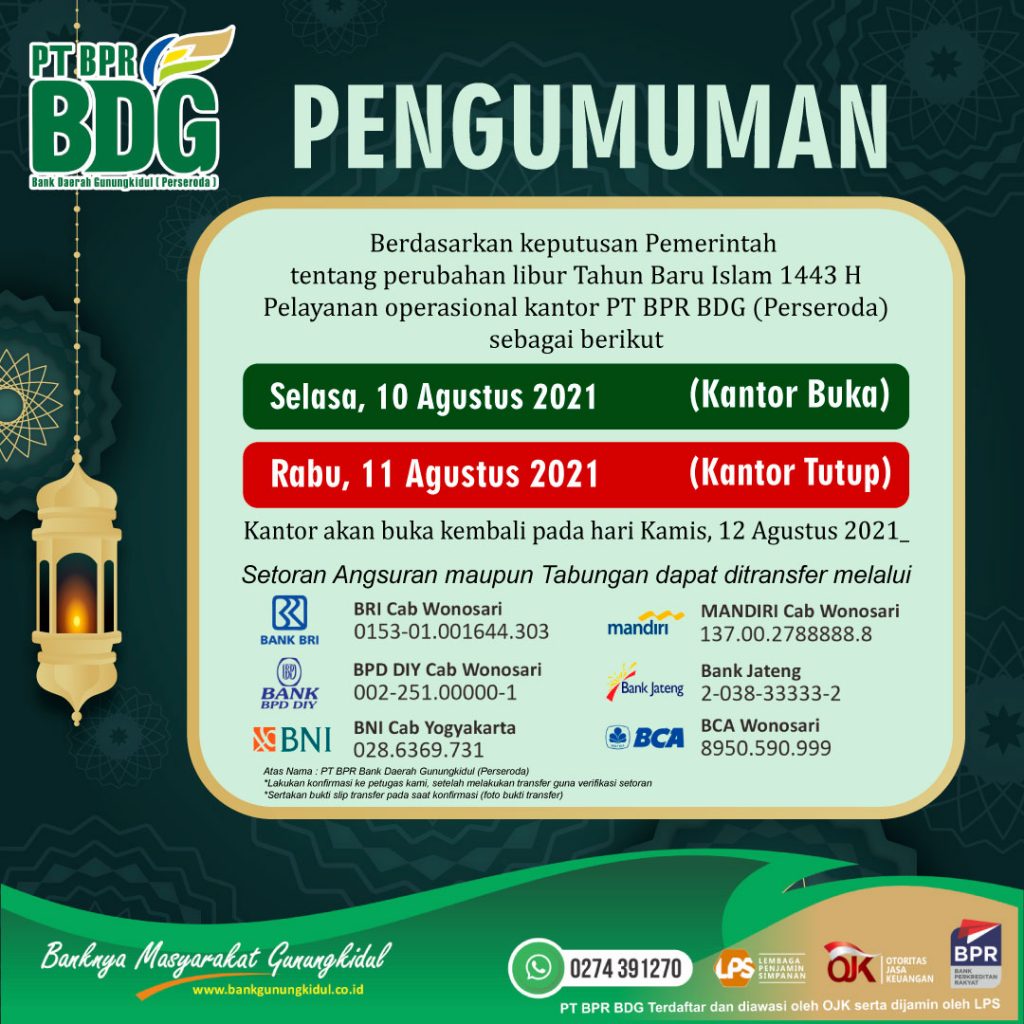 Pengumuman PENGUMUMAN PERUBAHAN HARI LIBUR TAHUN BARU ISLAM 1443 H PENGUMUMAN PERUBAHAN HARI LIBUR TAHUN BARU ISLAM 1443 H PEMBERITAHUAN JAM OPERASIONAL PPKM SELAMAT TAHUN BARU ISLAM 1443 H
