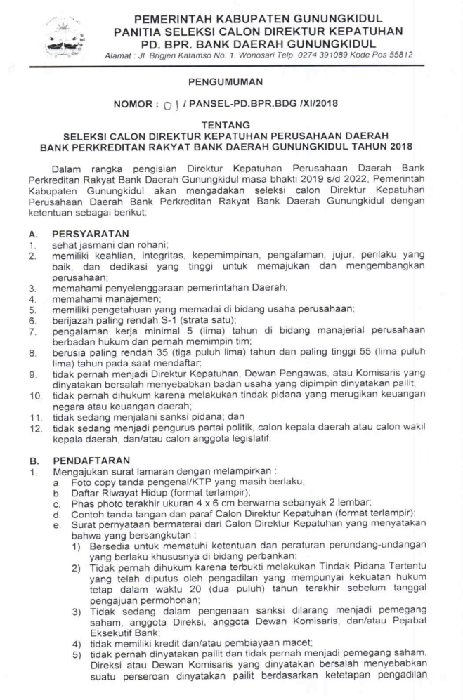 Pengumuman PENGUMUMAN SELEKSI CALON ANGGOTA DEWAN PENGAWAS PD BPR BDG 2019 Promo Kredit UMKM FLAT ‘BUNGA MURAH’ Per 1 Februari 2019 Daftar Pemenang Arisan Armasda Periode Februari 2019