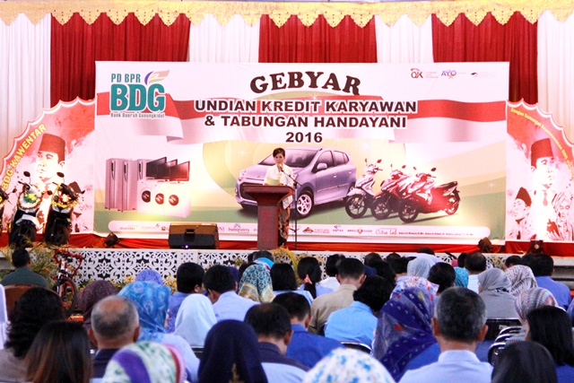 Wonosari – PD BPR Bank Daerah Gunungkidul (Bank BDG) mengadakan kegiatan undian kredit karyawan dan tabungan Handayani. Acara ini dilaksanakan Hari Rabu 16 November 2016 di Gedung Serbaguna Siyono. Acara ini di hadiri oleh Ibu Badingah, S.Sos selaku Bupati Gunungkidul.